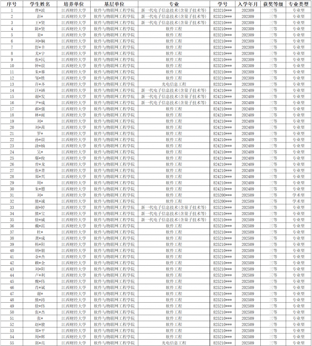 三等硕士研究生学业奖学金( 55人)