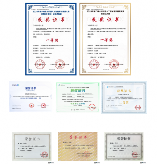 这些主动探索与实践,他在大学期间均一一落实。凭借对人工智能领域的初步学习和了解,他成功斩获第六届全球校园人工智能算法精英大赛—算法挑战赛—钢材表面缺陷检测与分割赛道全国一等奖。他回忆道:“国赛初期我们成绩欠佳,当时赛方明确要求模型参数规模需控制在1M以内。”他们先尝试调整模型结构、优化核心模块,但性能整体提升有限,且国赛仅剩不到一周,不同方案的试错成本已不允许他们在模型上继续反复尝试。意识到这一问题后,他们果断调整方向,将主攻重点从“修改模型” 转向 “专攻数据增强”,经过采用多种增强策略,借助多张显卡并行运行多个训练方案以高效试错,核心目标是精准拟合赛方提供的测试数据集分布。最终8k 原始数据扩充至 16.8w 规模,通过这种“过拟合” 的方式积累的大量细节分数,他们的队伍成功跻身全国第十。